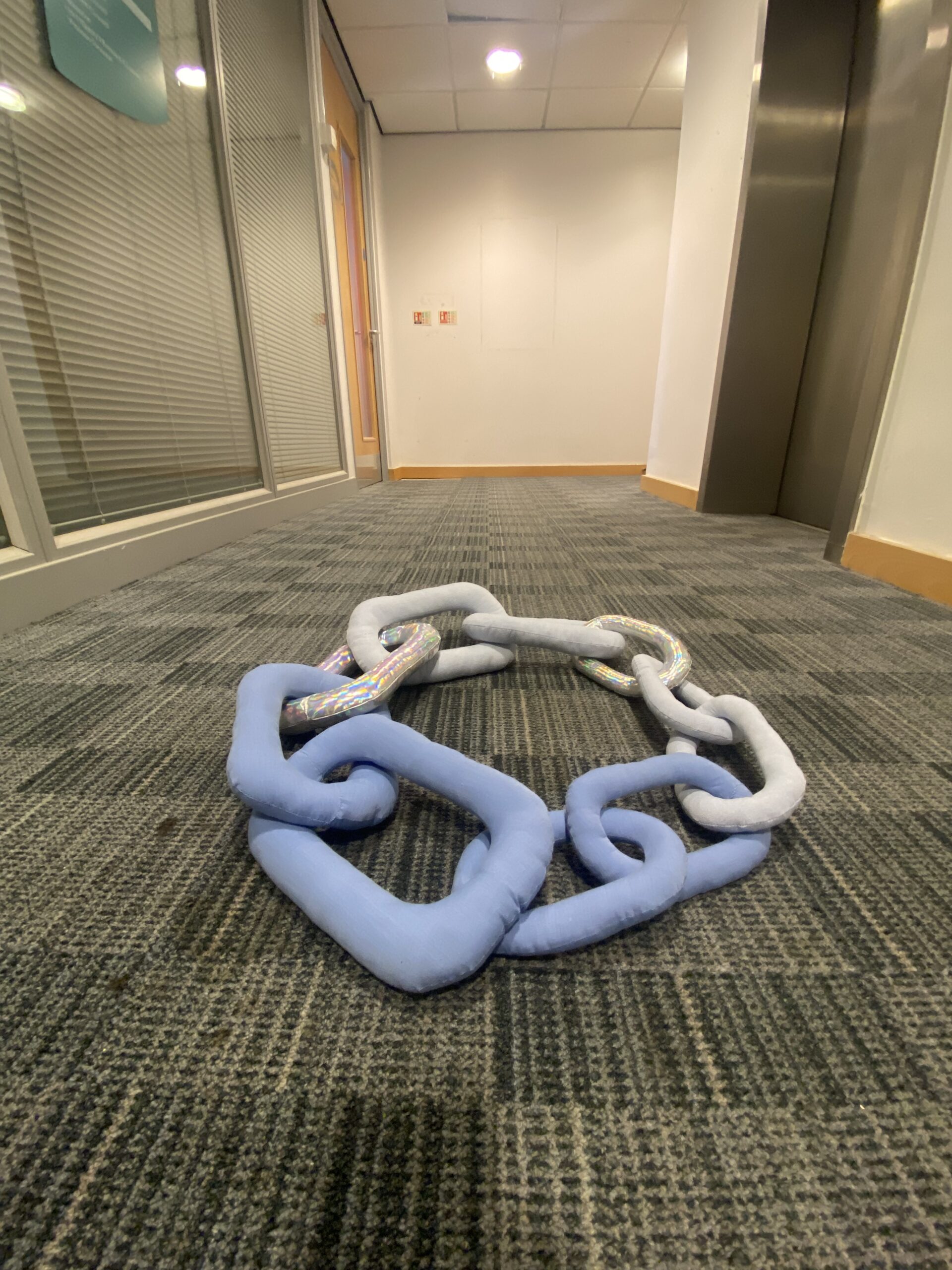 Let’s Have a Chat, padded reclaimed office shirts, holographic PVC, 2022.